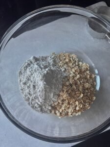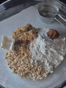 • In a medium bowl, mix together the oats, almond flour, cinnamon, and salt. Add the melted plant-based butter and sugar-free brown sugar substitute, stirring until the mixture resembles coarse crumbs.